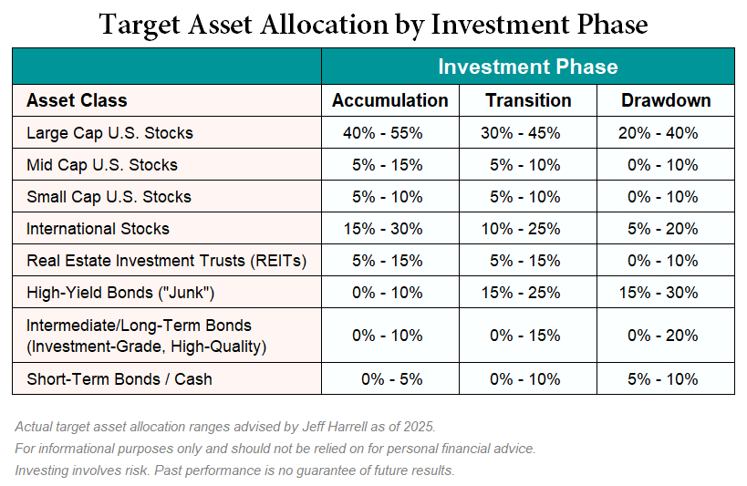 Target Asset Allocation by Investment Phase table - illustrates recommended target asset allocations by asset class during the three investment phases of Accumulation, Transition, Drawdown